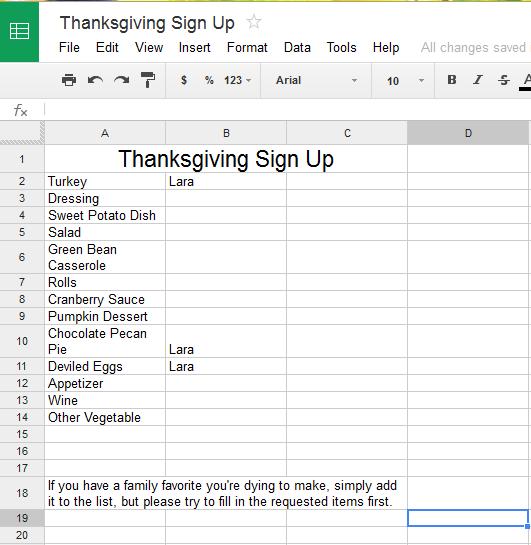 If you’re worried about non-cooks, offer sign up options like a bottle of wine or a cash contribution towards the turkey.  You know your guests, so you know what they’d appreciate or find offensive.  Sharing the load not only makes things easier for you, but it also gives individual cooks their opportunity to bring their killer mashed potatoes and feel helpful.  If you don’t like Google Docs, there’s also meal organizing sites like Perfect Potluck.