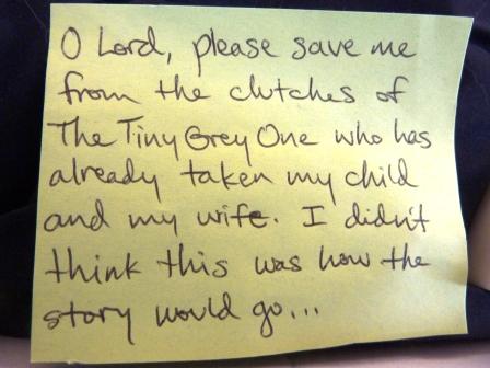 I gave Carolina a very stern talking to, and did a little looking into whether or not I could get a replacement baby Jesus. Two nights later, Mary bit the dust. Again, she was smashed to smithereens. There was no gluing her back together. Only Joseph remained, standing alone and undoubtedly afraid. Our roommate at the time had a little fun and attached this post-it note prayer to him: