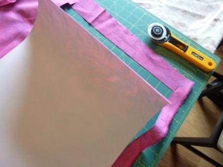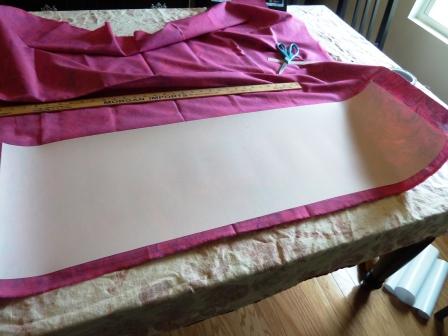 6. Remove a few inches of the paper backing to expose the adhesive on the styrene. Use those tracing lines you just made as a guide to keep it straight, and slowly stick down your styrene to your fabric. Smooth out lines and air bubbles as best you can as you go.