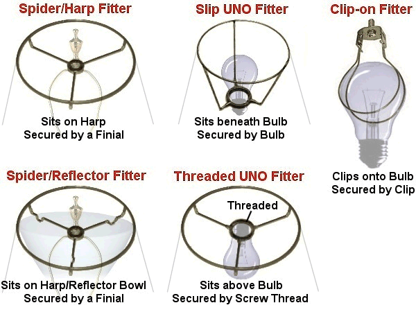 Almost all of our lamp parts will come from The Lamp Shop. You need to order two lamp rings, one plain bottom ring, and one top one that works with your fitting. This is where you need to look at your lamp base. See what type of fitting it uses so you know what kind of lamp ring to get. Here’s a graphic of the most common types.
