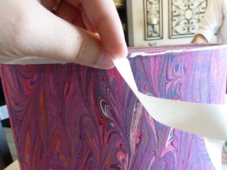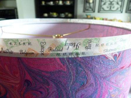 If you remember from our calculations earlier when the shade was flat, it was 38.5 inches wide, which means I needed at least 38.5 inches of paper tape for both the top and bottom, for a total of 77 inches of tape. My brain was not working correctly, and I only ordered a yard of the tape, which is 36 inches. The Lamp Shop was generous and gave me a little more than a yard, so I was able to get all the way around my bottom ring before I ran out and realized my mistake. All I could find that was even remotely close to the paper tape in a craft store was decorative Washi tape. It worked fine, but looks a little silly.