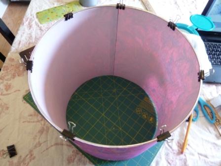 10. Okay, now you’re going to roll up your fabric into the shape of a shade. Hold the bottom lamp ring just inside the top of the fabric, and use the binder clips to get the ring to stay in place there. It looks like this: