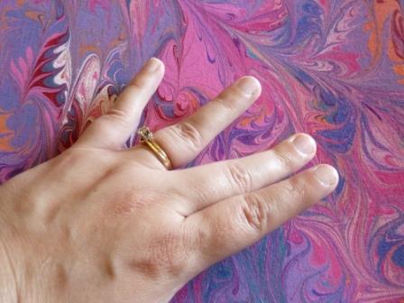 If you are wondering where I got my fabric, it’s a hand marbled fabric I bought from an artist in Oregon named Marjorie Lee Bevis. She was very easy to work with, answering a few questions I had, and even sending me pictures of a couple different samples. It’s even more stunning in person. She sells lots of different colors at her website MarbledFabrics.com.