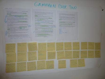 Another board for book two, where I was trying to decide what events to keep from an outline of the first draft I wrote. The outline is the typewritten pages at the top, and the post-its at the bottom are what I eventually decided to use. To help you get a perspective of how much I’m changing, the occasional green highlights you see in the outline were the only “must keep” events I had.
